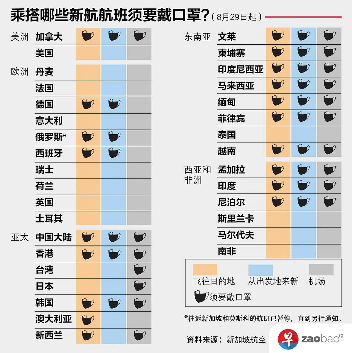 根据新航提供的名单,一些仍须戴口罩的国家包括马来西亚、印度尼西亚、加拿大、德国和中国等。没有强制规定的则有美国、英国、意大利和泰国等。