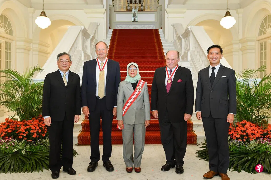 (早报讯)多年来对本地生物科学界和金融界发展做出重大贡献,新加坡科技研究局荣誉高级院士大卫·莱恩教授(David Lane)和瑞士再保险公司荣誉主席瓦尔特·基洛茨(Walter Kielholz)获颁荣誉公民奖。