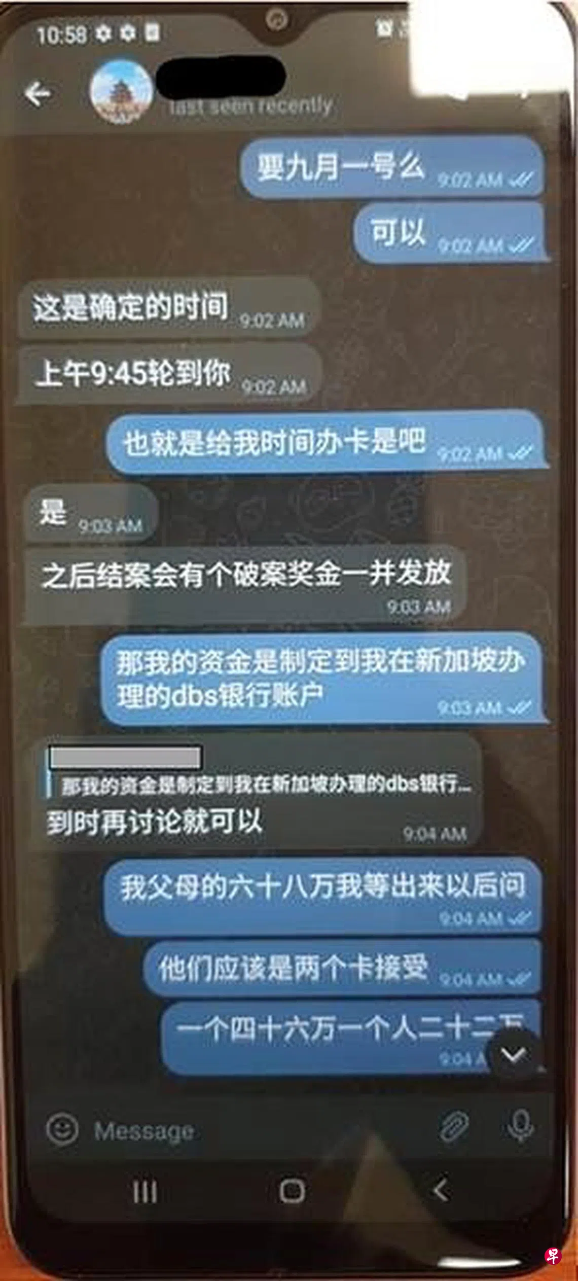 初步调查也显示,一名58岁男子按照骗子的指示,帮受害者预定酒店房间,并把一台附有SIM卡的手机交给受害者,让受害者用这部手机与骗子联系。