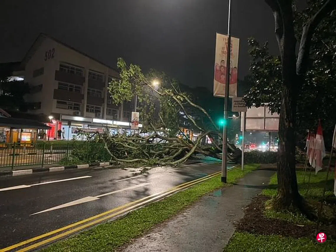 据悉,交通一度受阻四小时,当局事发当天早上6时许才将大树锯成数块移走。