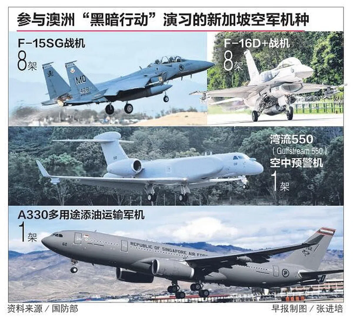 自1990年起定期参演的新加坡空军今年派遣八架F-15SG战机、八架F-16D+战机、一架湾流(Gulfstream)550型空中预警机、一架A330多用途添油运输军机(Multi-Role Tanker Transport,简称MRTT)和超过400名空军部队人员参加演习。