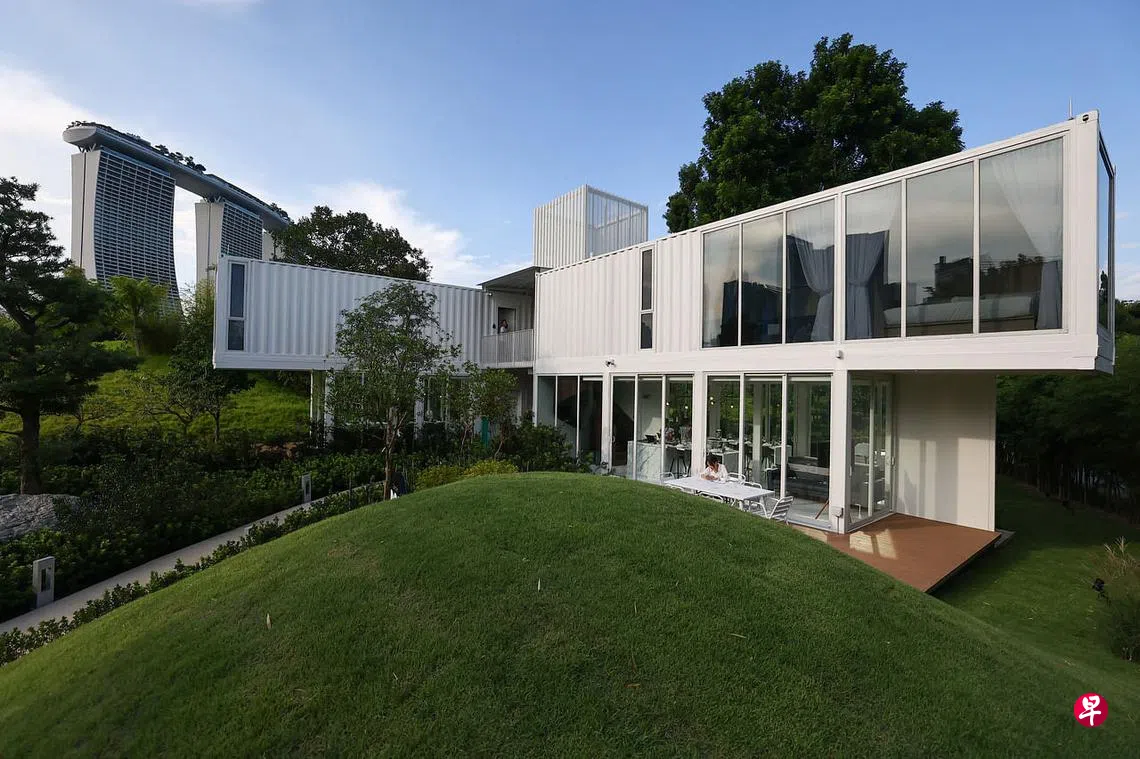 (早报讯)滨海湾花园新开幕的集装箱酒店,让住户置身于大自然环境中,欣赏新加坡的花园城市面貌。酒店由集装箱组成四间双层楼套房,内含寝室、用餐空间、厨房,以及浴室,每晚收费从450元起跳。
