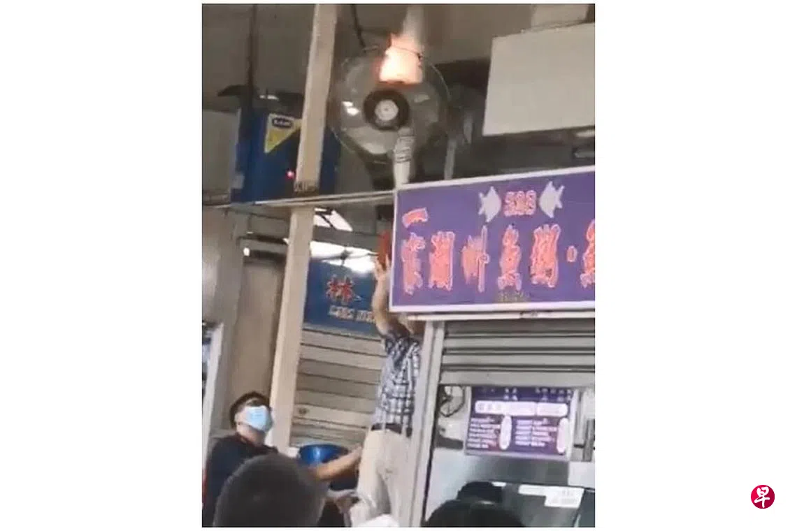 《联合早报》读者陈嘉勋(40岁,当铺职员)当时正巧在小贩中心吃早餐,看到鱼汤档口上方的风扇突然蹿起一团火苗,持续燃烧。