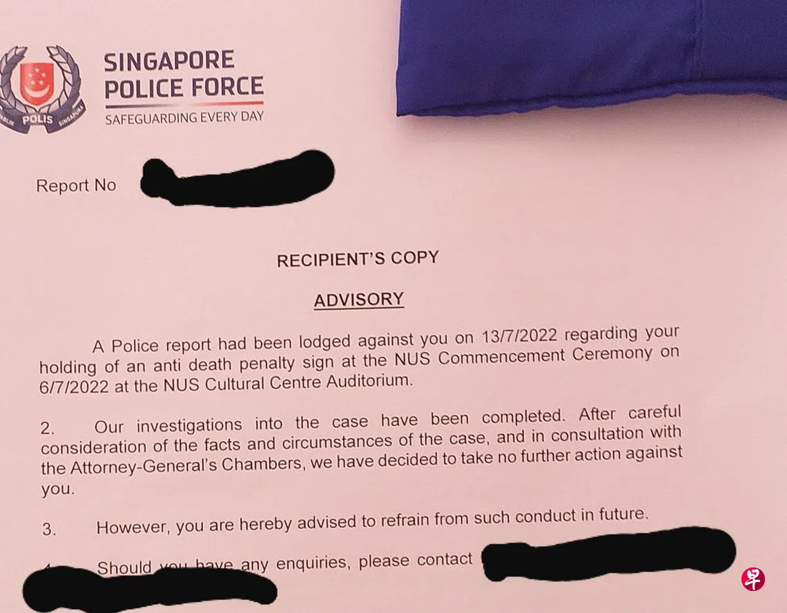 警方答复《联合早报》询问时证实,当局咨询总检察署后,对这名在国大毕业典礼上抗议死刑的24岁男子发出书面劝告。