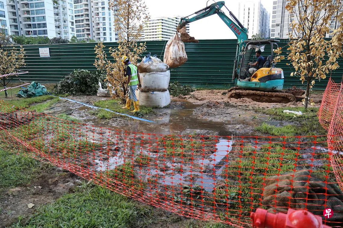记者走访时,确实发现组屋附近有块空地,部分区域有施工,草地也有积水的情况。