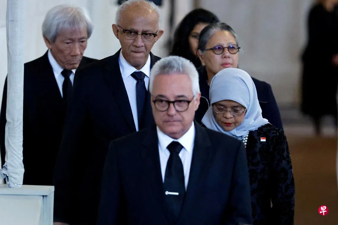 (早报讯)新加坡总统哈莉玛和夫婿穆罕默德星期天(9月18日)到伦敦威斯敏斯特厅瞻仰英女王伊丽莎白二世灵柩。他们星期一将参加国葬仪式。
