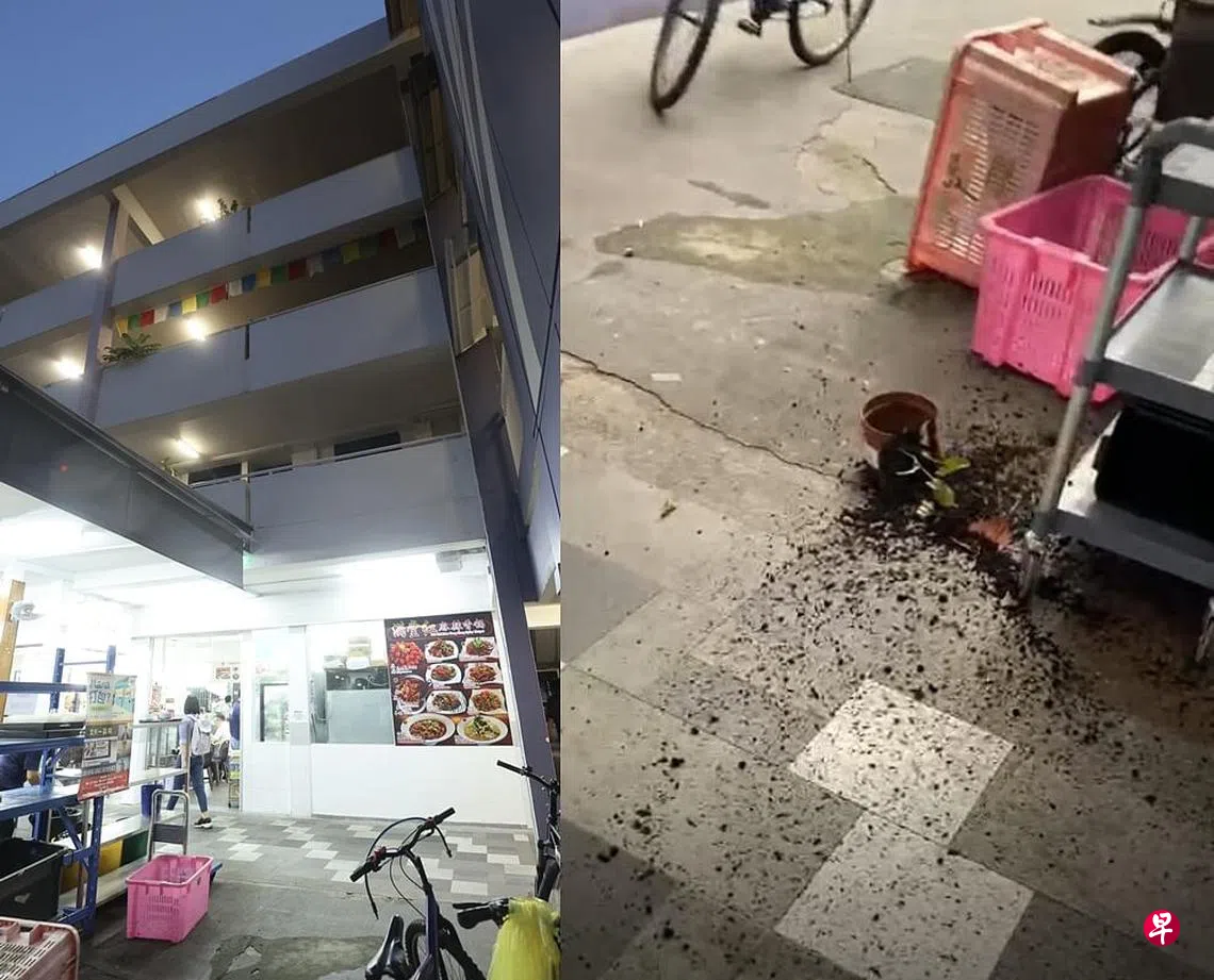 事发组屋高四层,盆栽砸在靠近碗碟归还处的走道外,泥土散落一地。碎裂的陶盆贴着价格标签,字迹依然清晰,显然是不久前购买的。