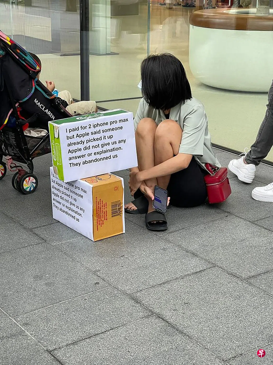 声称订购两台苹果新手机,指苹果专卖店让别人把手机取走,女子坐在乌节路店前“抗议”,举动引热议。