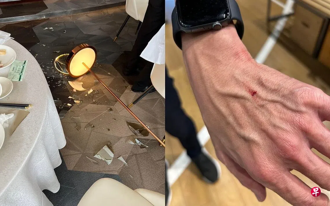 (早报讯)男子到餐馆用餐,落地灯突然倒下,玻璃碎片飞溅割伤手。