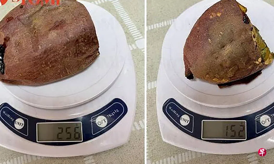 (早报讯)有顾客申诉,DON DON DONKI热卖的烤甜薯重量差异太大,足足少了100克。不过,记者亲测,重量差异其实不大。