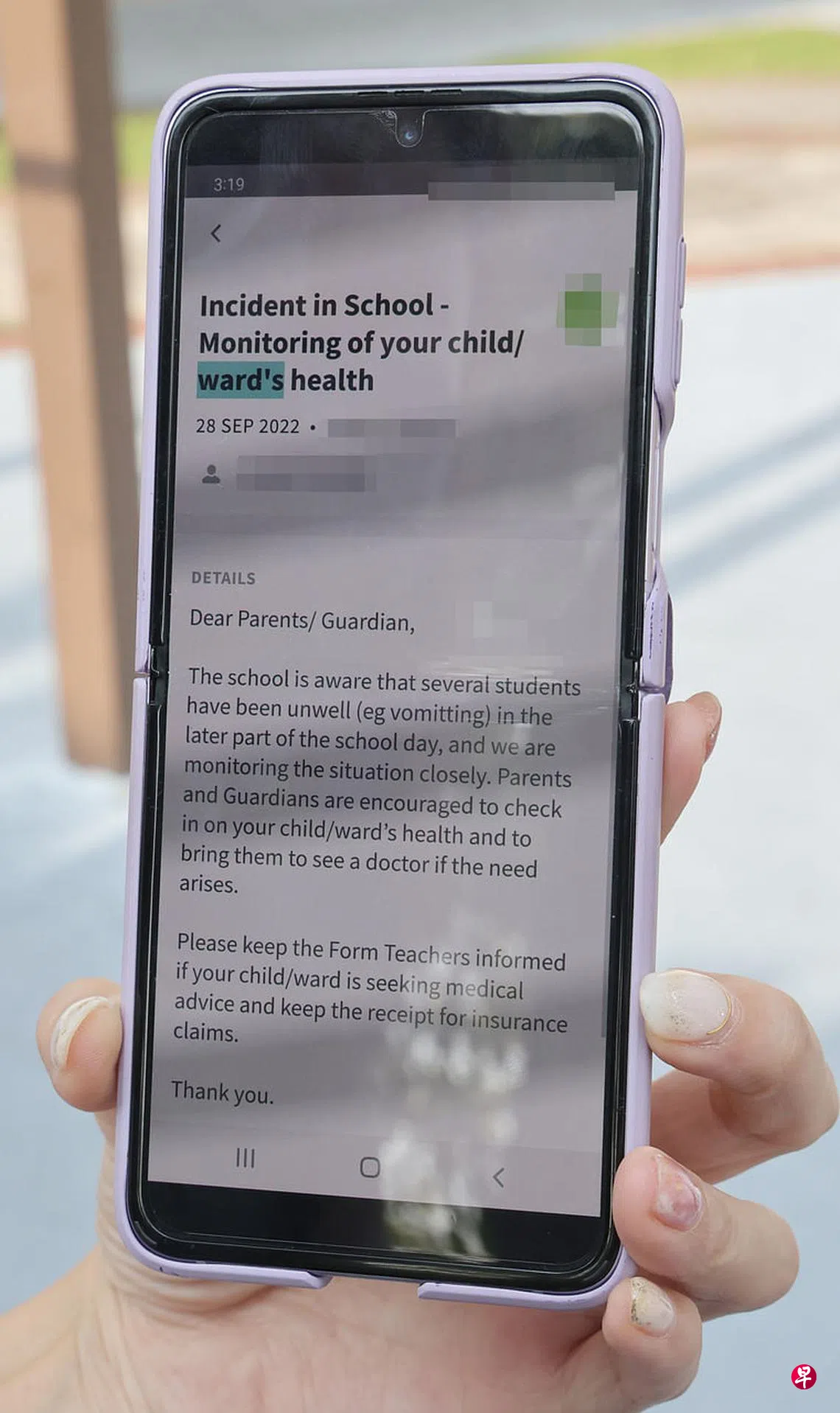 《联合早报》记者下午到校外向家长了解情况时,有家长说收到校方的短信通知,家长的群组里也有人提到食物中毒事故。不愿具名的家长说,校方事发后第一时间发短信给家长和监护人,告知学校里有学生感到身体不适,出现呕吐等症状,校方正在密切关注事态的发展。