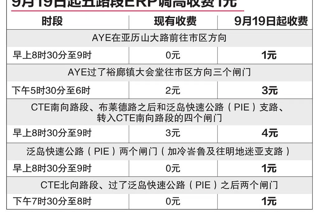 陆路交通管理局早前宣布,8月1日起,CTE在布莱德路之后的南向路段,及泛岛快速公路(PIE)支路、转入CTE南向路段的收费闸门,早上8时至8时30分的ERP上调1元;CTE北向路段、过了PIE之后的闸门,傍晚7时至7时30分的路费也同样调高1元。