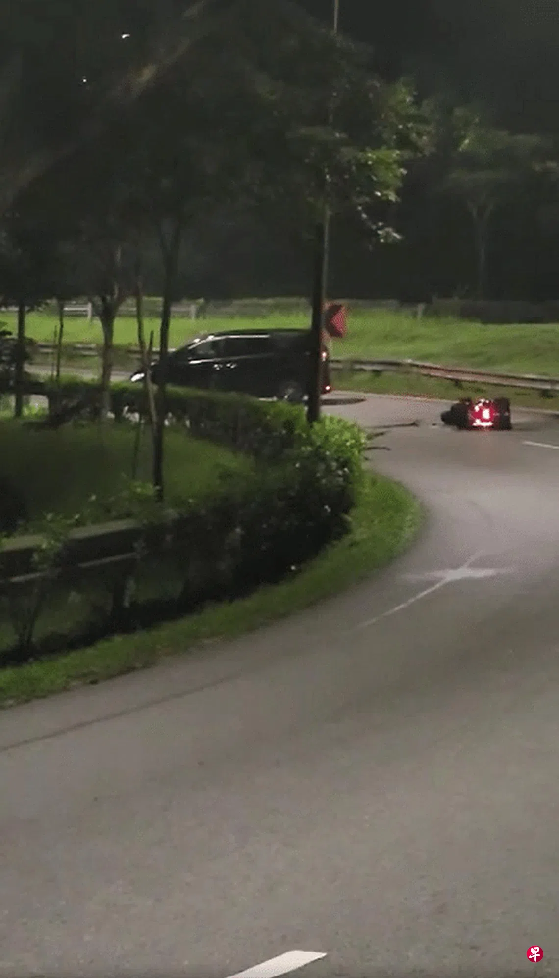 《联合早报》早前报道,在这起车祸中受伤的是一名身穿白色上衣的电单车骑士,他事发时在支路的右边车道行驶,怎料在弯路行驶之际,前方突然出现一辆逆向行驶的黑色汽车。电单车骑士闪避不及,被黑色汽车撞上,翻转一圈后卧倒在地。