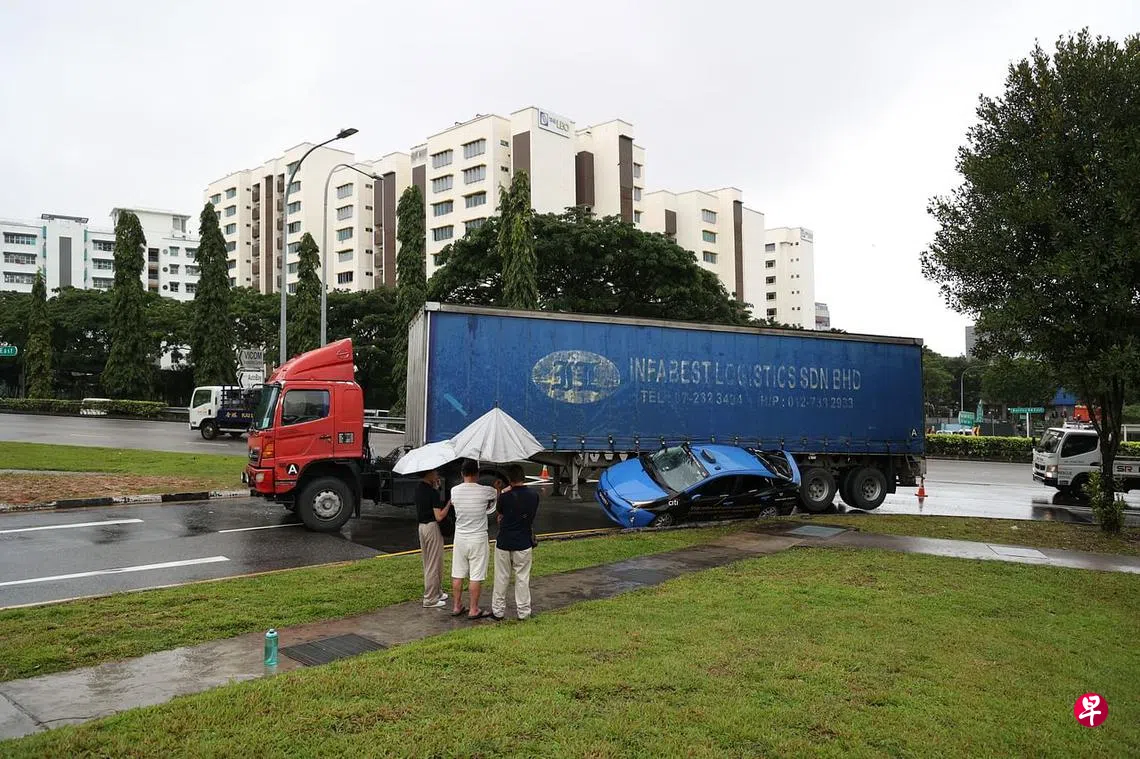 《联合早报》记者约下午4时30分经过现场,看见一辆卡车与一辆德士相撞,德士的挡风玻璃裂开,后面的镜子及右边前后座的玻璃都破碎;卡车左后方轮子离地,两名交警在现场疏导交通。