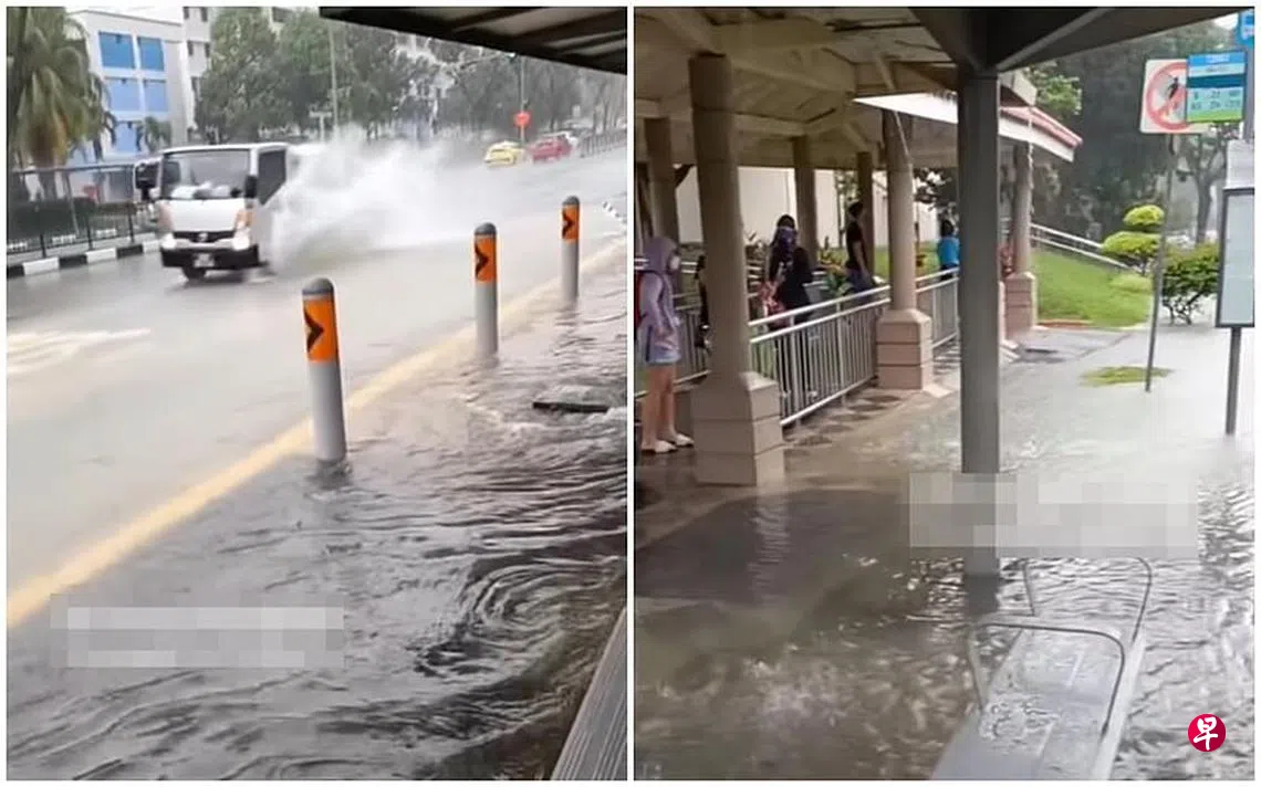 (早报讯)全岛近日下起倾盆大雨,巴士站变“水池”,公众“躲”后方等车。