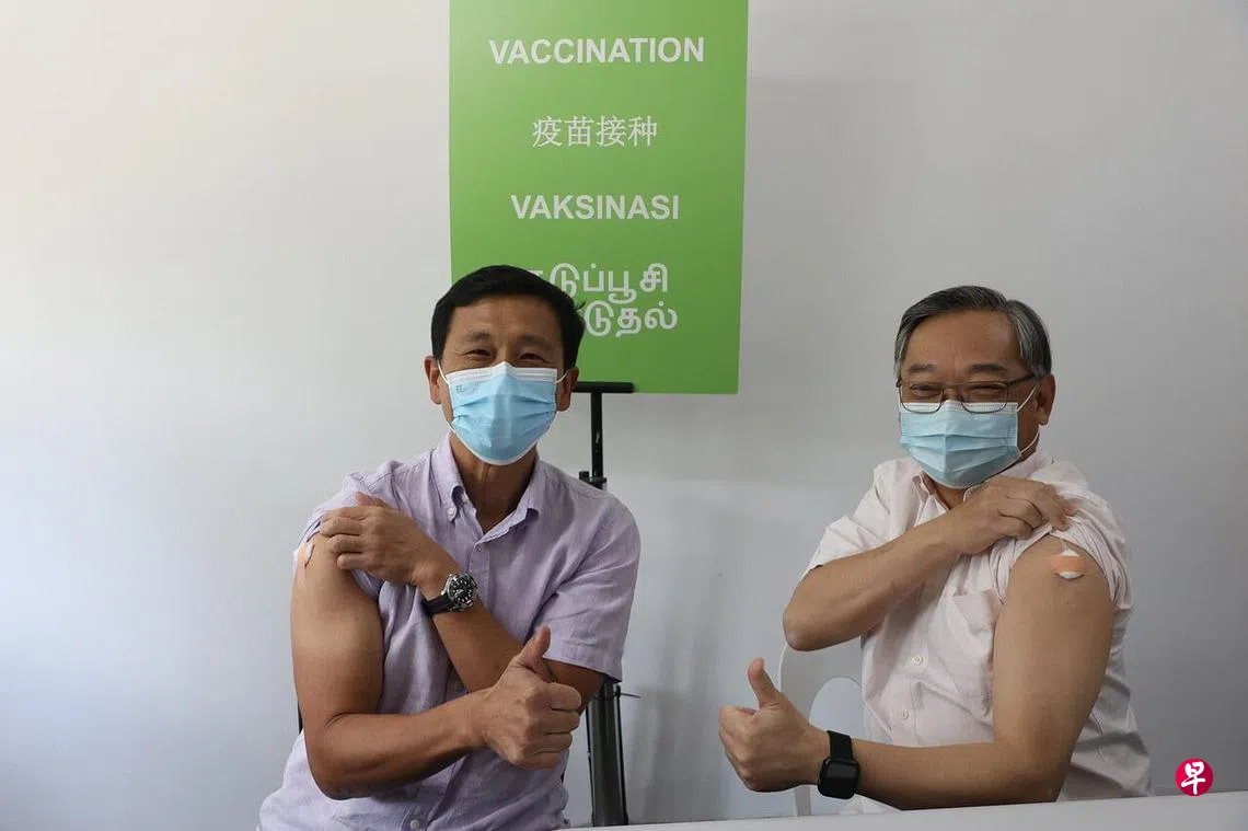 联合领导抗疫跨部门工作小组的卫生部长王乙康和贸工部长颜金勇,星期二(10月11日)到联邦通道的联合检测与疫苗接种中心注射二价(bivalent)疫苗。这款疫苗可同时对抗冠病原始毒株和奥密克戎变种毒株。