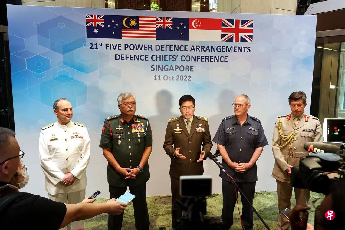 正在新加坡出席第21届五国联防安排(Five Power Defence Arrangements,简称FPDA)军事首长会议的新加坡、马来西亚、英国、澳大利亚和新西兰军方高层星期二(10月11日)在会后联合接受媒体访问。担任会议主席的新加坡三军总长王赐吉中将说,随着安全形势和挑战演变,FPDA的联合演习和行动也必须在向来作为核心的军事行动成分之上继续更新。