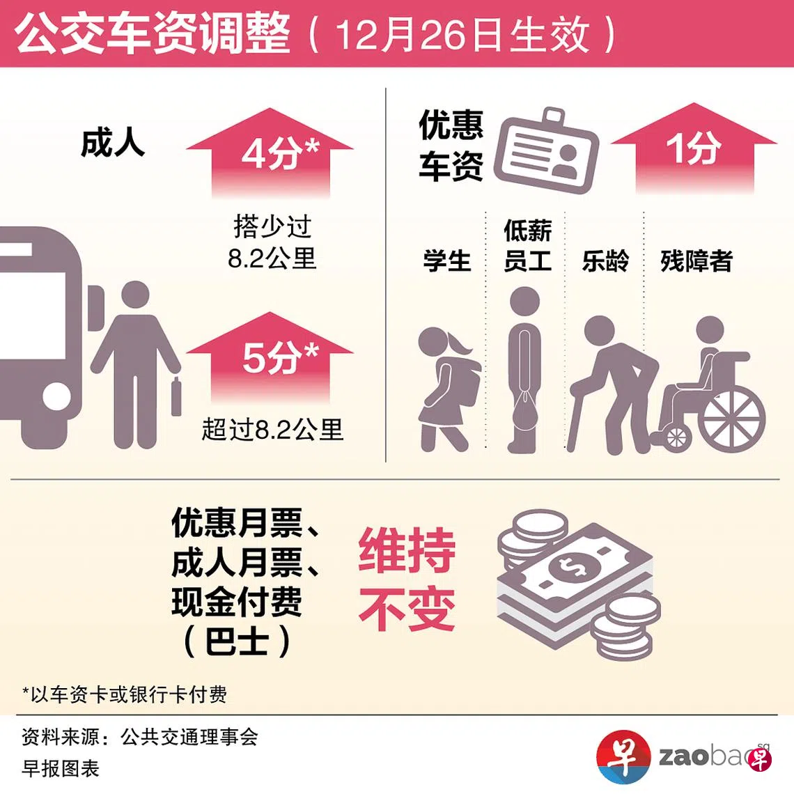 优惠月票价格、成人月票,以及以现金付费的巴士车资维持不变。