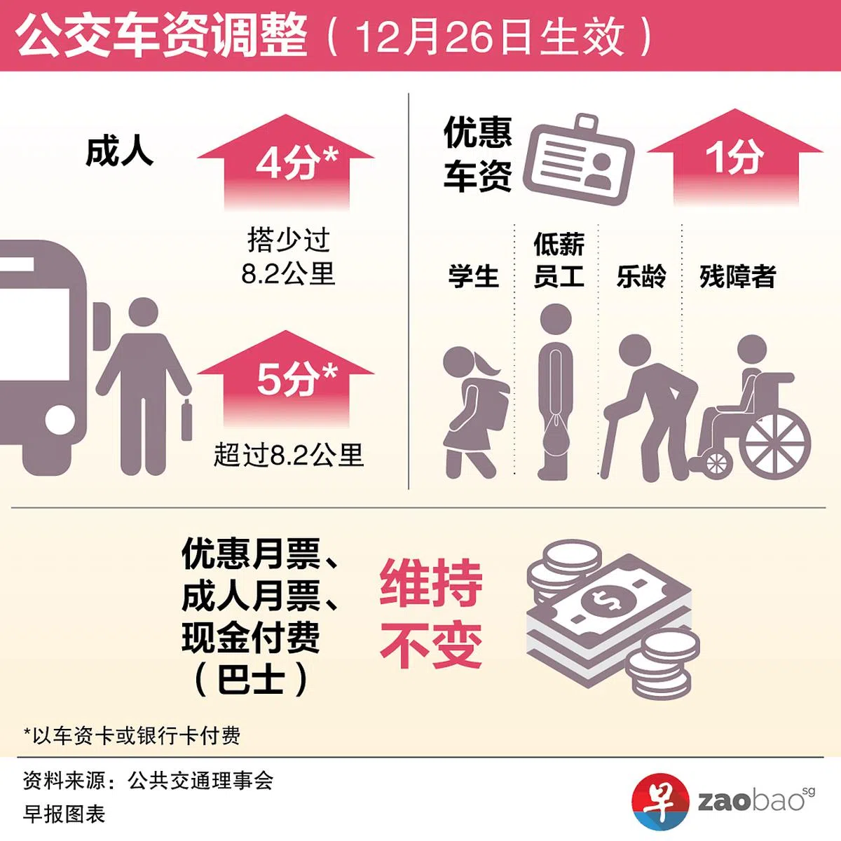 公共交通理事会星期三(10月12日)宣布从12月26日起上调地铁和巴士车资。其中,以车资卡或银行卡付费的成人车资每趟上调4分至5分。