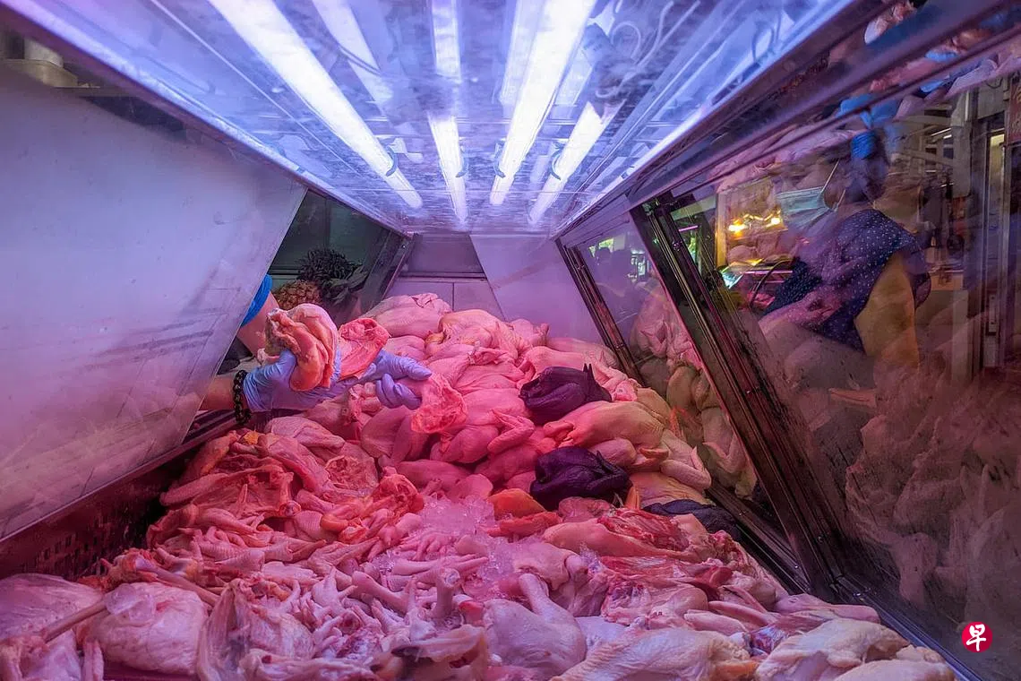 同样在忠邦城湿巴刹售卖鲜鸡肉的陈姓摊主(55岁)说:“我的进货量较少了30%至40%,先试一试水温。今天生意不好,可能因为是观音出家日,很多人吃素或去庙宇祭拜。”