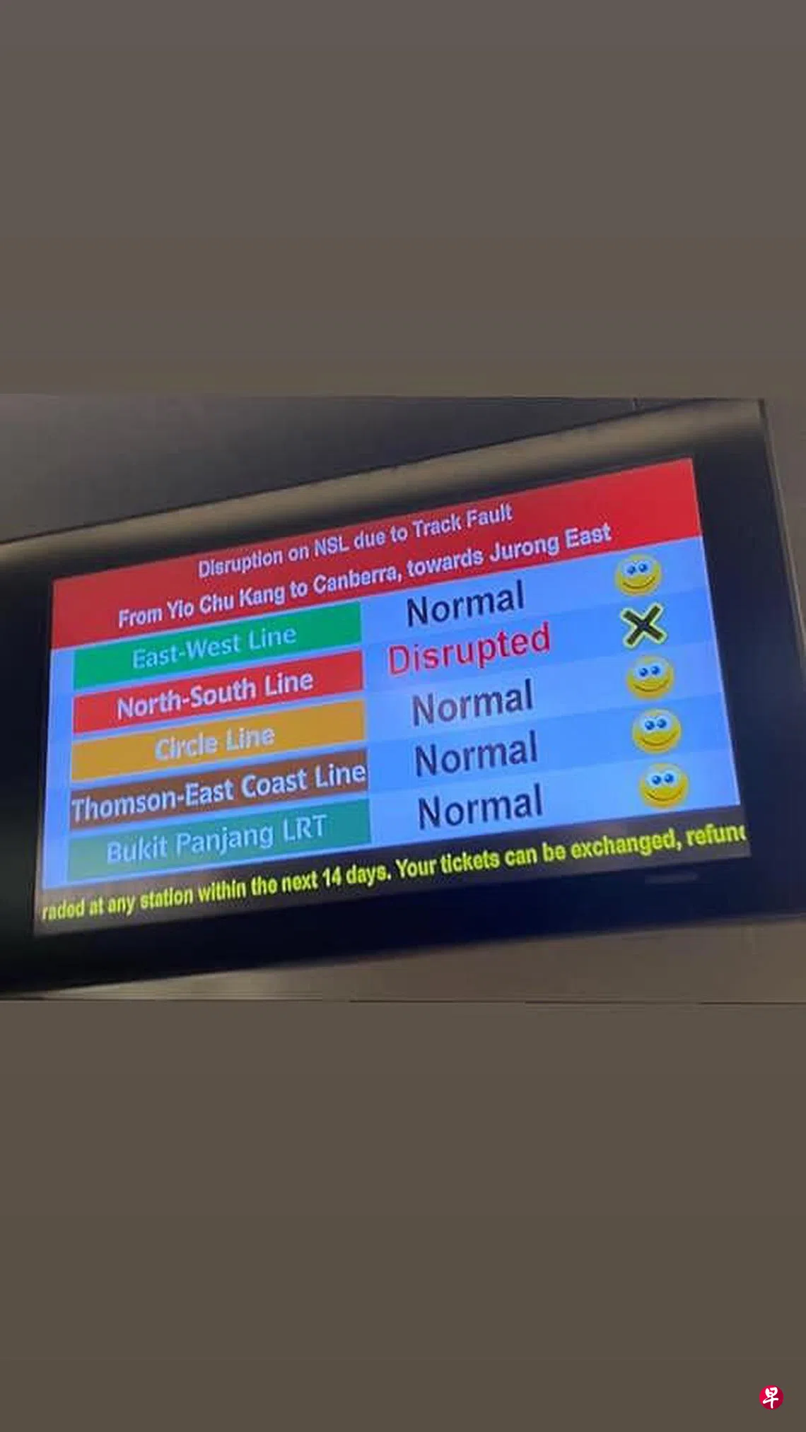 (早报讯)南北地铁线星期三(10月19日)早上出现延误,杨厝港到坎贝拉站服务受影响。