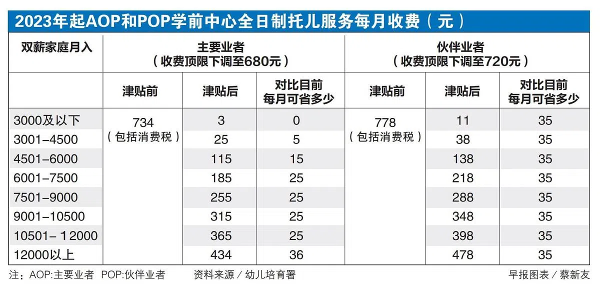 (早报讯)明年1月1日起,主要业者和伙伴业者学前教育中心的全日制托儿和托婴服务,每月收费顶限皆降低40元;主要业者经营的幼稚园,每月收费顶限则降低10元。约10万名在这些由政府资助的学前中心上课的公民孩童,将可支付更低廉的费用。