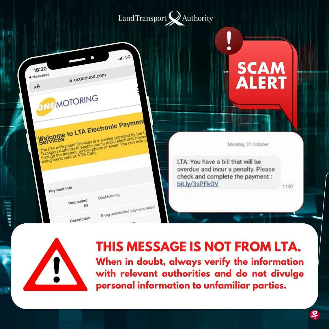 (早报讯)又有人假冒陆交局发短信,称受害者有未缴付的账单因此可能被罚款,要求受害者点击链接付款。