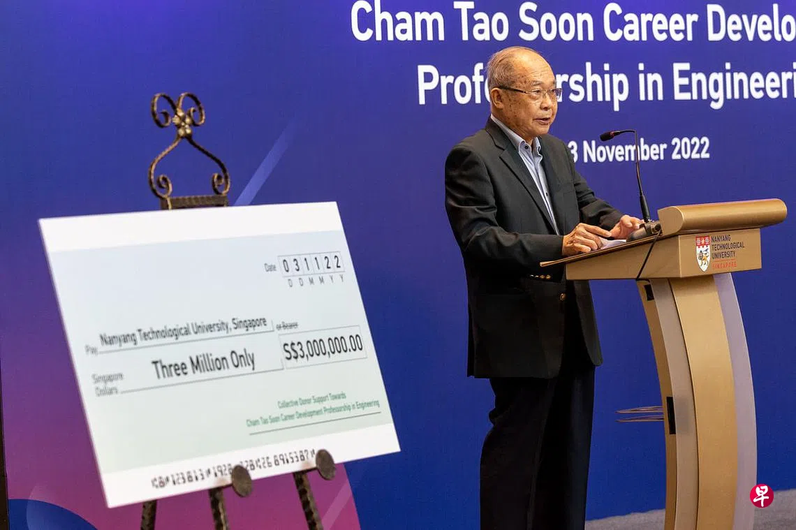 南大星期四(11月3日)宣布设立“詹道存教授工程学职业发展教授席”(Cham Tao Soon Career Development Professorship in Engineering),以表彰处于职业生涯中期、且在工程领域取得杰出成就,并具备发展潜力的南大工程学院教职员。