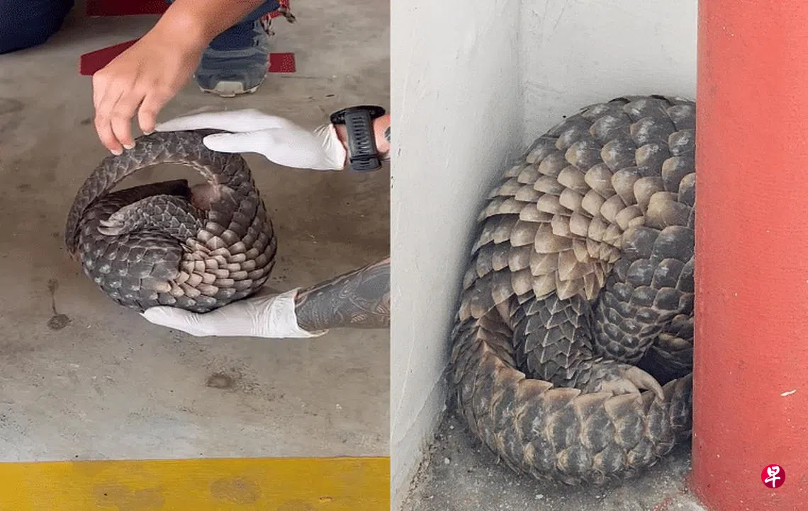 (早报讯)三巴旺组屋停车场出现稀有的穿山甲,居民见状立刻拨电给关爱动物研究教育协会前来救援。