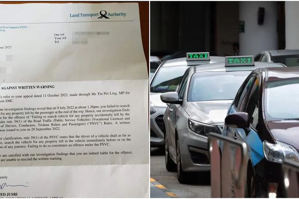 一名德士司机今年7月9日,因没检查乘客是否在德士落下物品,违反了条例,过后收到当局的警告信。根据网上流传的信函,他通过议员陈佩玲提出上诉,但不成功,当局10月26日回复说,无法撤销书面警告。