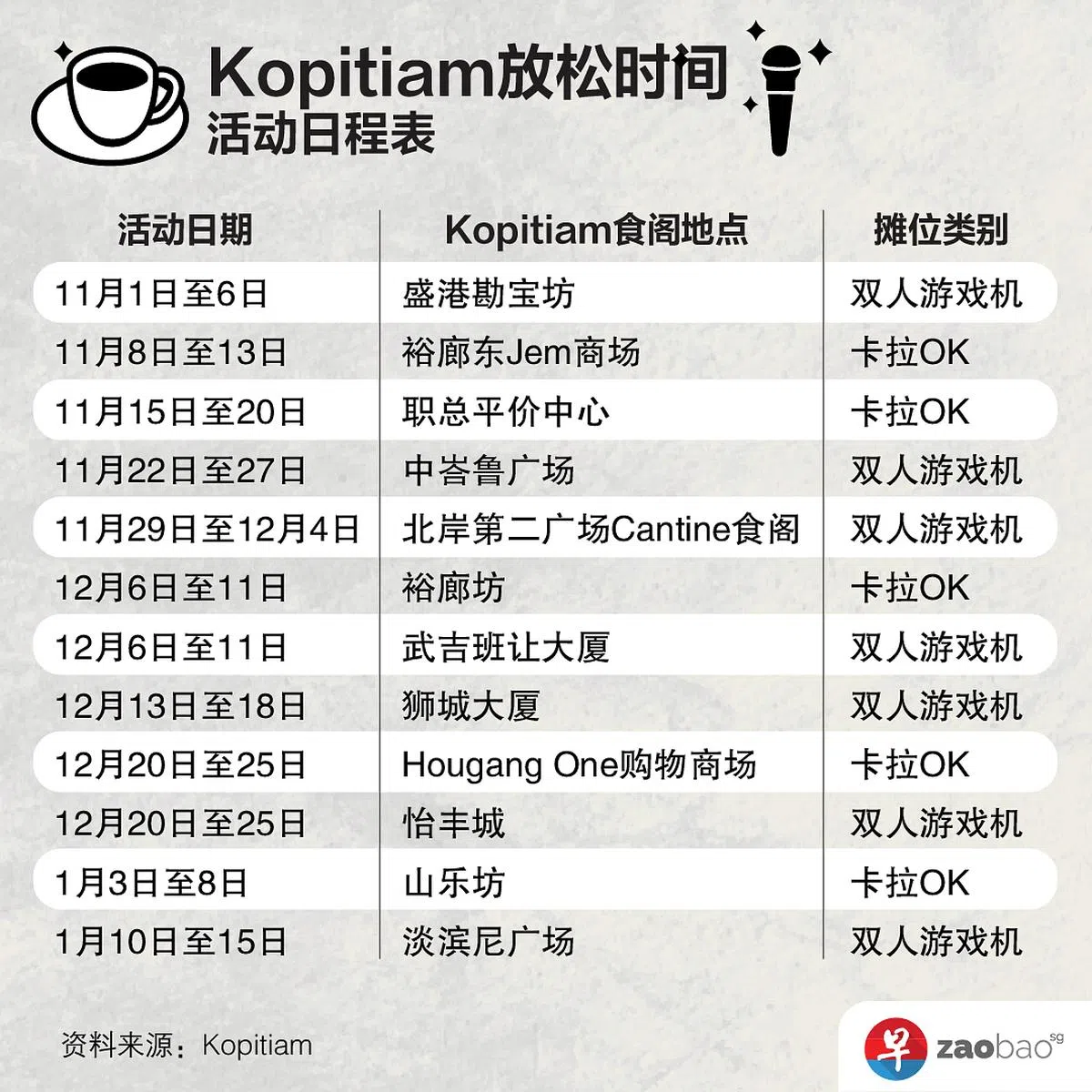 (早报讯)食客到Kopitiam食阁消费6元以上,可到食阁里的迷你K歌舱里高歌一曲。