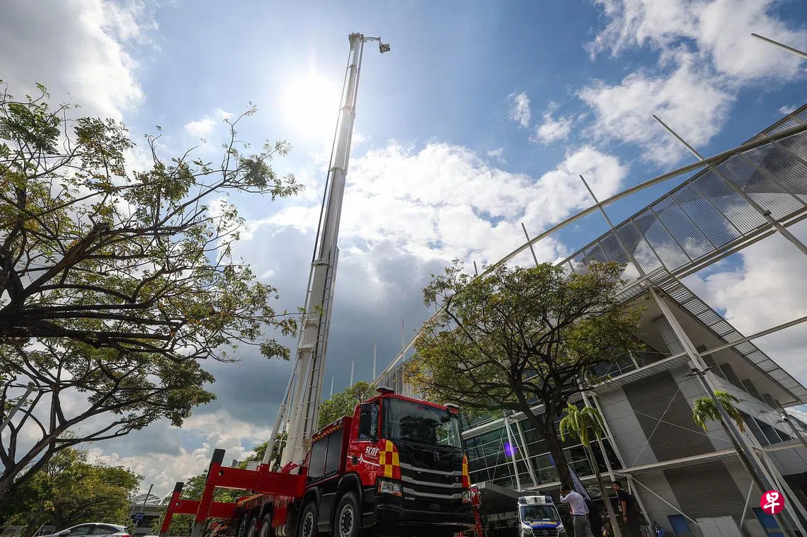 相等于30层楼高的消防云梯,完全伸展时比樟宜机场的控制塔(约81米)还高。这款云梯消防车是民防部队和内政科技局(HTX)合作研发,目前共有两辆,预计明年初正式启用,到时会分别停驻在加冷消防局和榜鹅消防局。