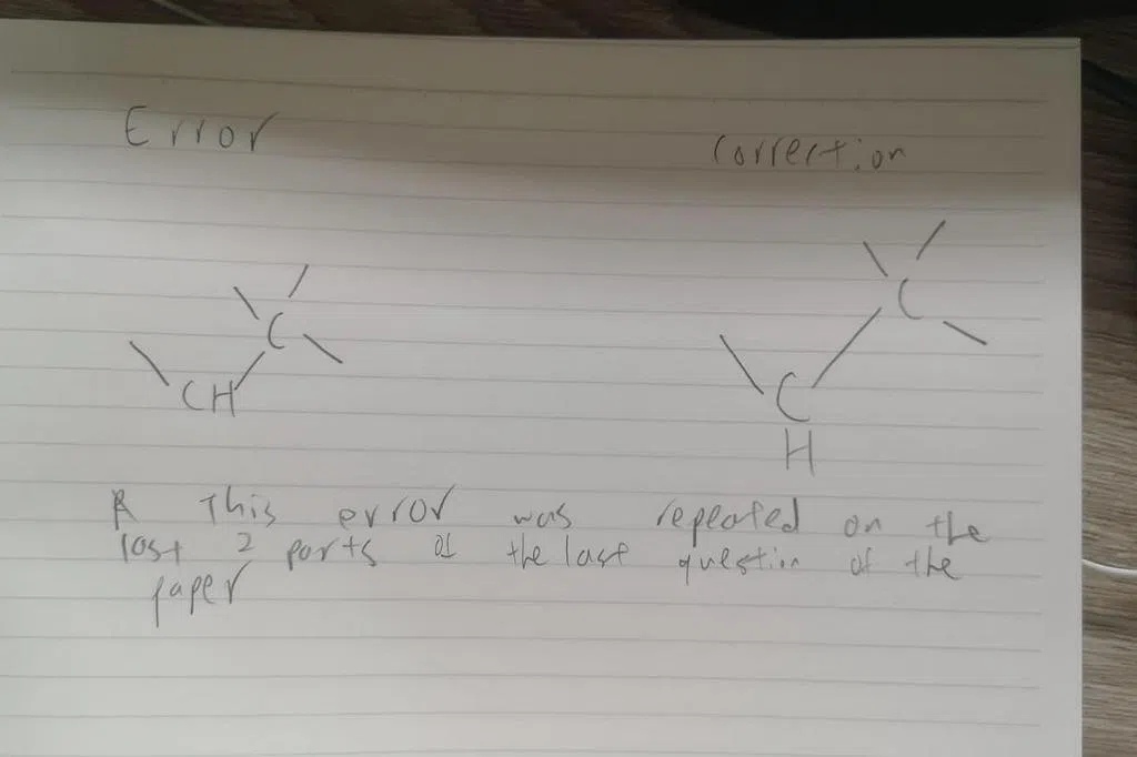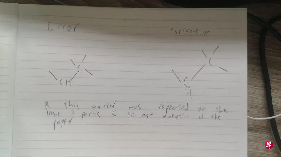 《联合早报》早前报道,A水准H2级化学第三试卷于星期三(11月16日)早上8时至10时进行。但试卷第五题出题错误,在考试开始前,考官用不同的方式纠正错误。有些初院的考官会拿着正确的化学结构图,到每个考生的座位亲自解释。另一些考官则是在考试进行到一半时,要求每位考生停笔,纠正错误,这个过程干扰了一些考生。