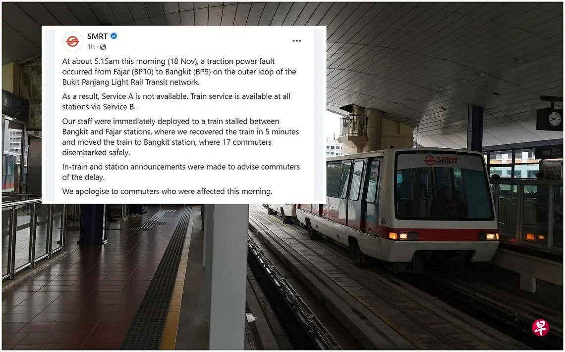 SMRT星期五(11月18日)在脸书上贴文说,武吉班让轻轨列车系统在早上5时15分左右发生部分电源故障,影响了从蔡厝港出发的路线A的服务。