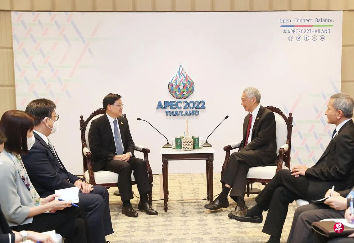 (早报讯)李显龙总理与香港特首李家超星期五(11月18日)下午在泰国曼谷的亚太经济合作组织(APEC)经济领导人会议场边会面,重申新加坡与香港密切和持久的合作关系。这是两位领导人首次会晤。