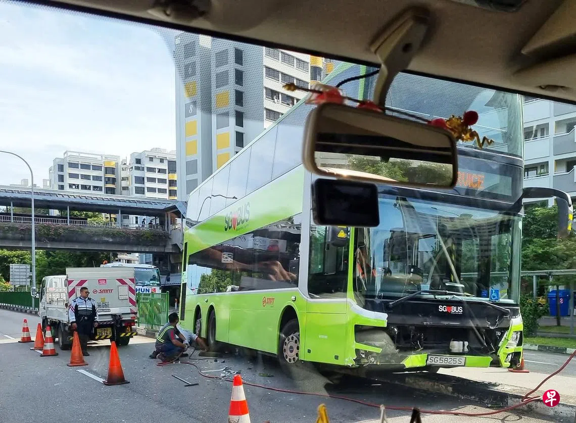 (早报讯)双层巴士冲上中央分界堤,车长协助调查。这起事件发生在星期五(11月18日)早上8时04分,地点是蔡厝港通道朝往蔡厝港路的方向。