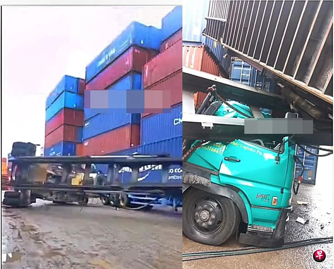 (早报讯)集装箱堆垛机(stacker)突然倾斜倒下,集装箱压中一辆拖车头,司机危急时刻跳到乘客座上保命,逃过一劫。
