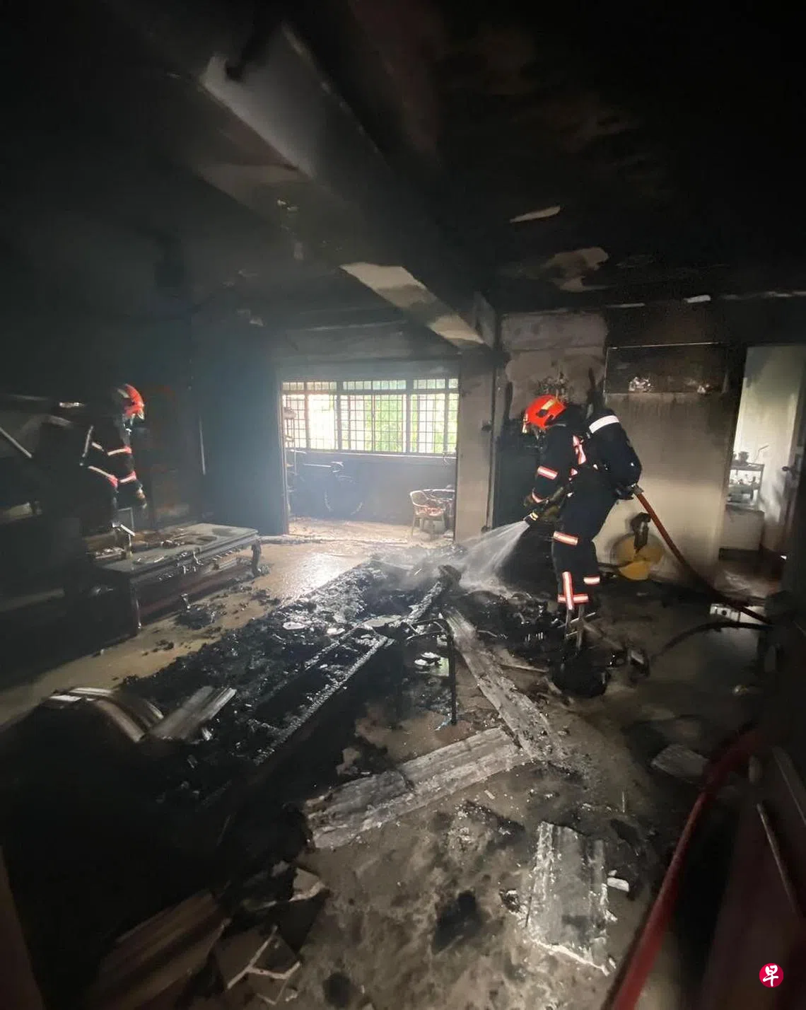 盛港消防局的消防员强行进入单位,用一支水枪将客厅的火扑灭。