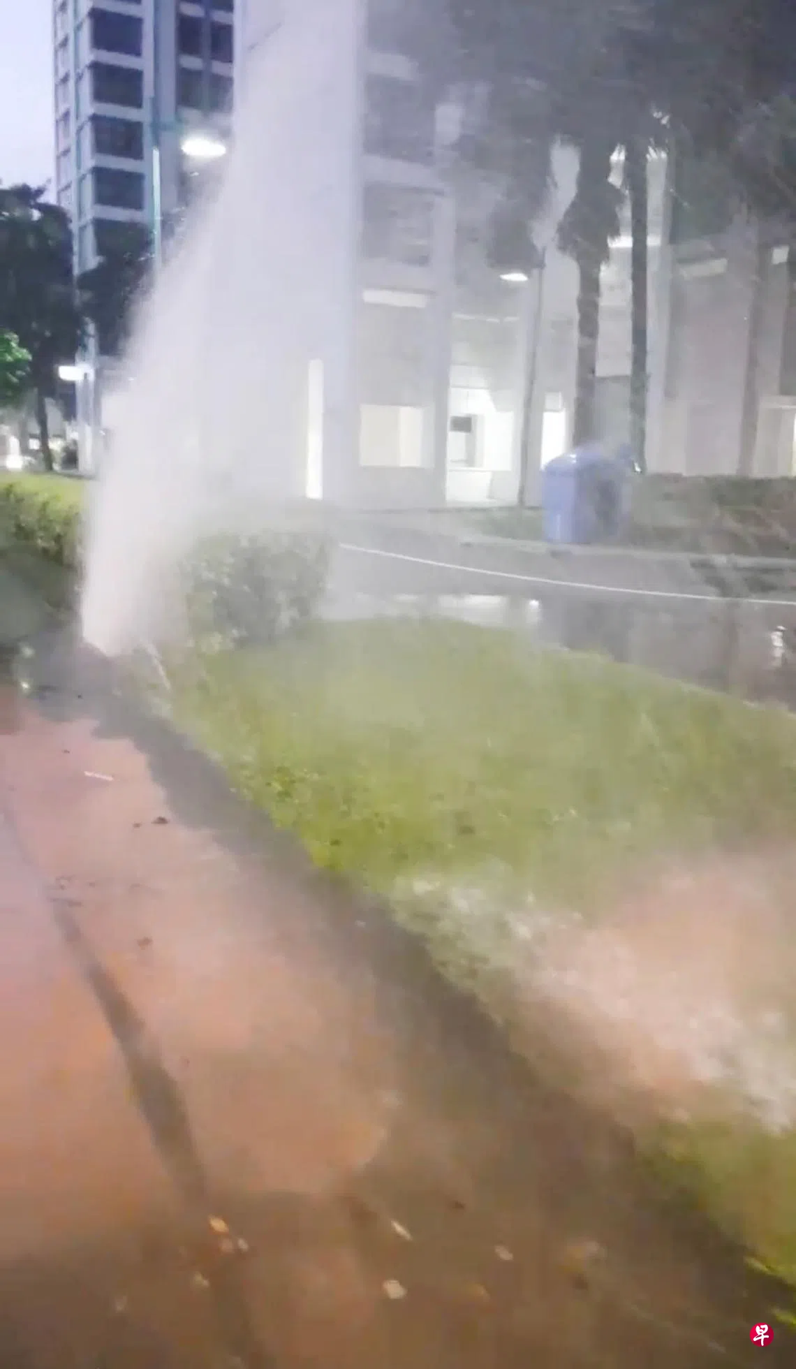 他说,相信是埋在地下的水管爆裂导致漏水,附近的草地、走道上都有积水,但马路则不受影响。