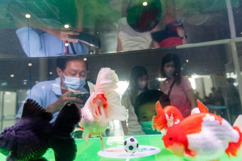 在新加坡博览中心举行的首届亚洲观赏鱼及园艺展览会设置了一缸七条金鱼,其中一条黑色的当“裁判”,让它们“踢球”,预测两场复赛的成绩。