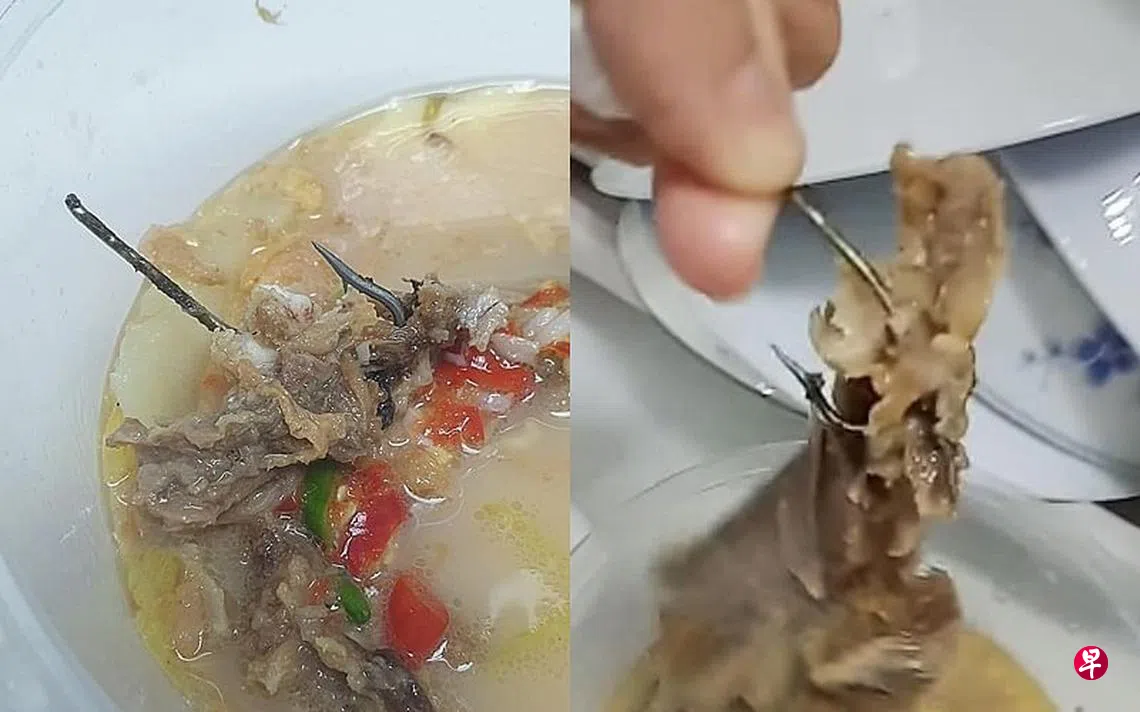读者通知《新明日报》,她的同事在上星期四(12月1日)到碧山巴士转换站二楼的鱼汤档口外带食物,但没想到食物里竟有一支鱼钩。