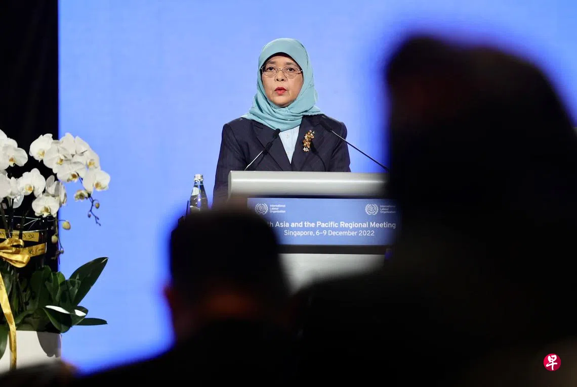 哈莉玛总统在国际劳工组织于新加坡举行的第17届亚太区域会议开幕仪式上,赞扬组织在保障劳工福利方面的贡献。