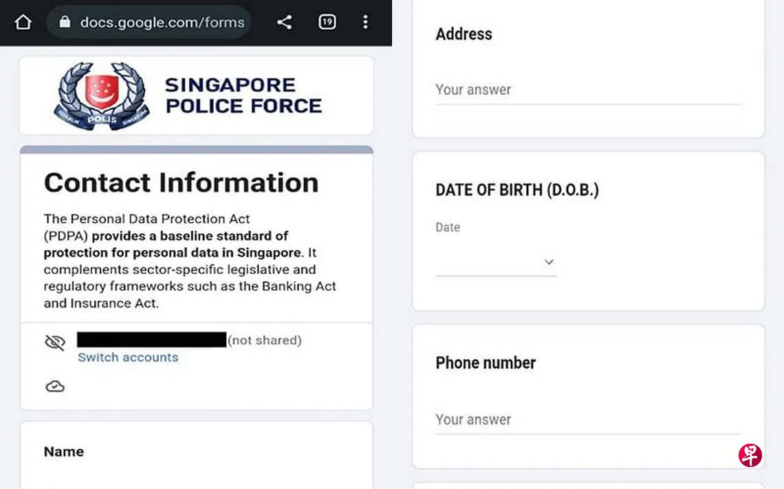 (早报讯)网络钓鱼骗案再出新招,骗子假冒警方发出谷歌表格索取个人资料,还会提供报案号码。