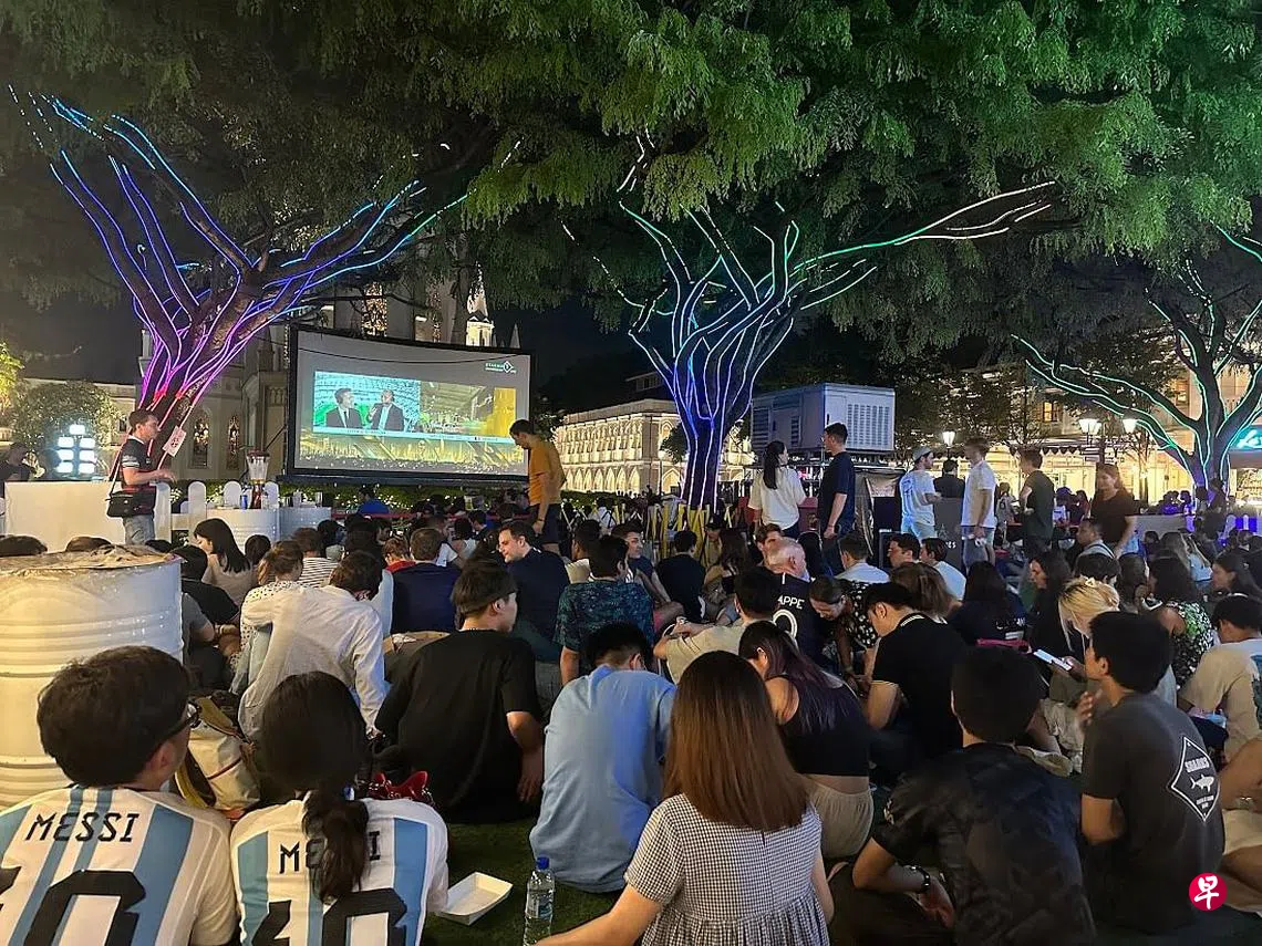 (早报讯)历时28天, 2022年卡塔尔世界杯即落下帷幕,星期日(12月18日)晚上8时30分,距离决赛开赛还有两个半小时,赞美广场已涌现了约500名球迷,国家图书馆一楼也有近100名观赛球迷。