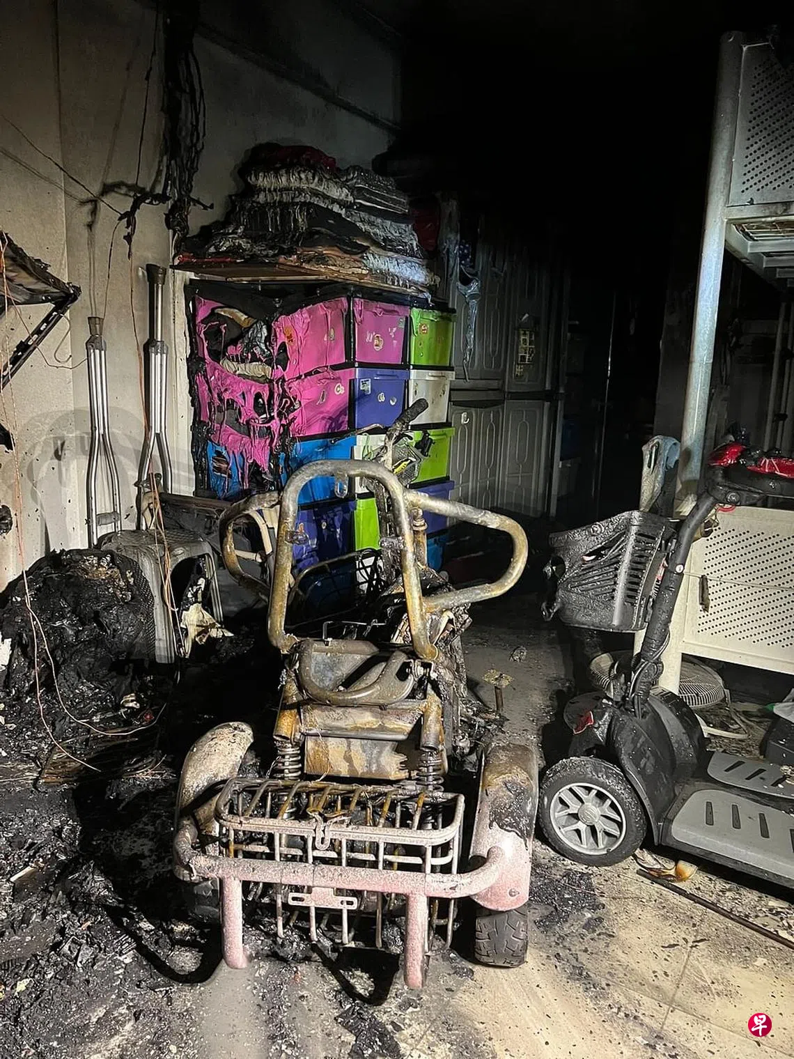 初步调查显示,失火原因是由摆放在客厅的行动辅助工具的电源所引起。