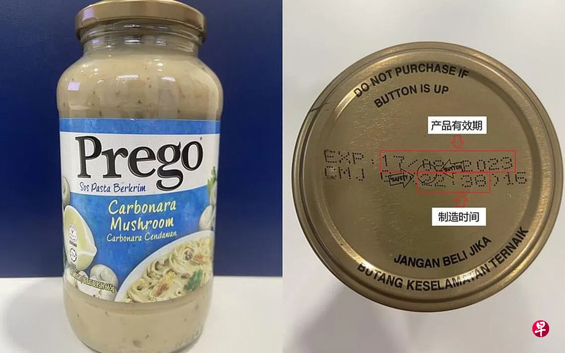 (早报讯)Prego一批蘑菇意大利面白酱(Carbonara Mushroom Pasta Sauce)因生产问题导致产品变质,新加坡食品局下令召回,并提醒公众不要食用。