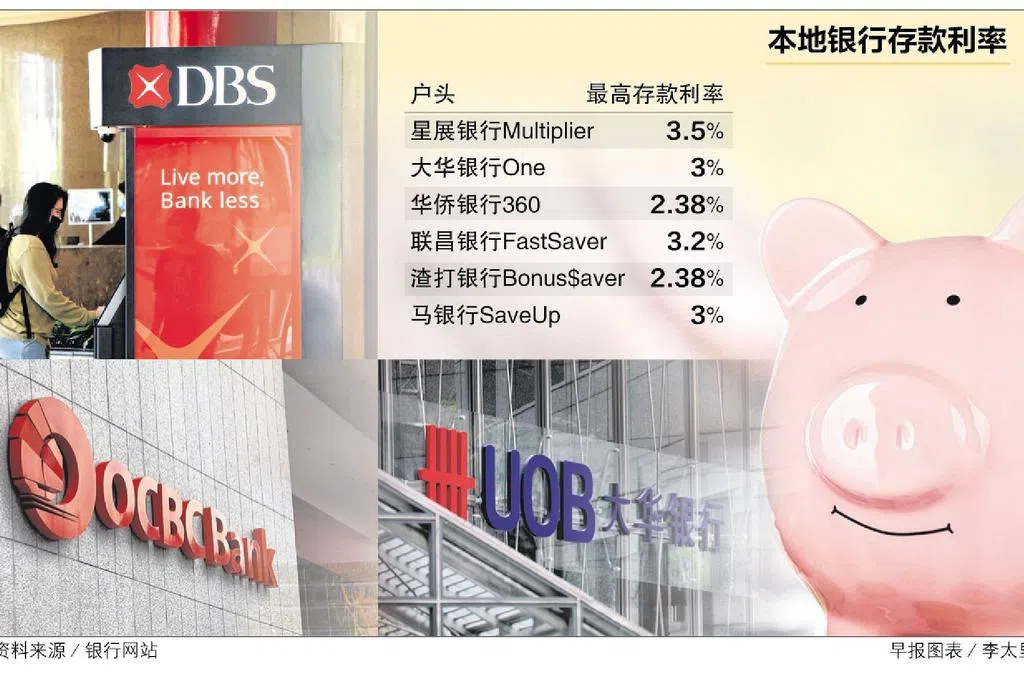 本地三大银行目前都开出多年来最高定存利率。星展银行这个月初就大幅调整现行定存利率(board rates),从之前最高的1.7%几乎翻倍至3.2%。这也是本地银行现行定存利率最高的。