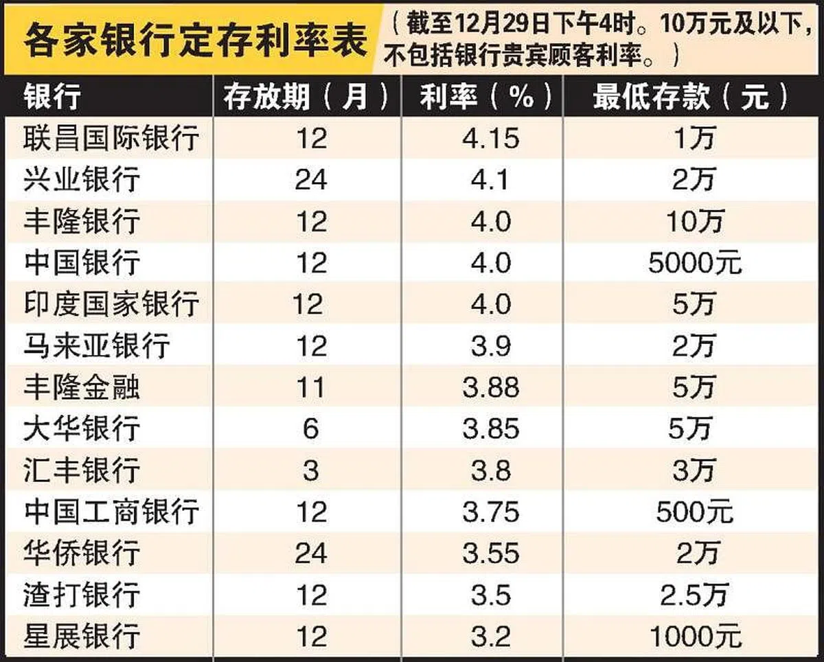 其他银行过去一个多月也纷纷上调定存促销利率吸客,多家开出4.0%或更高,当中以联昌国际银行4.15%的最具吸引力。