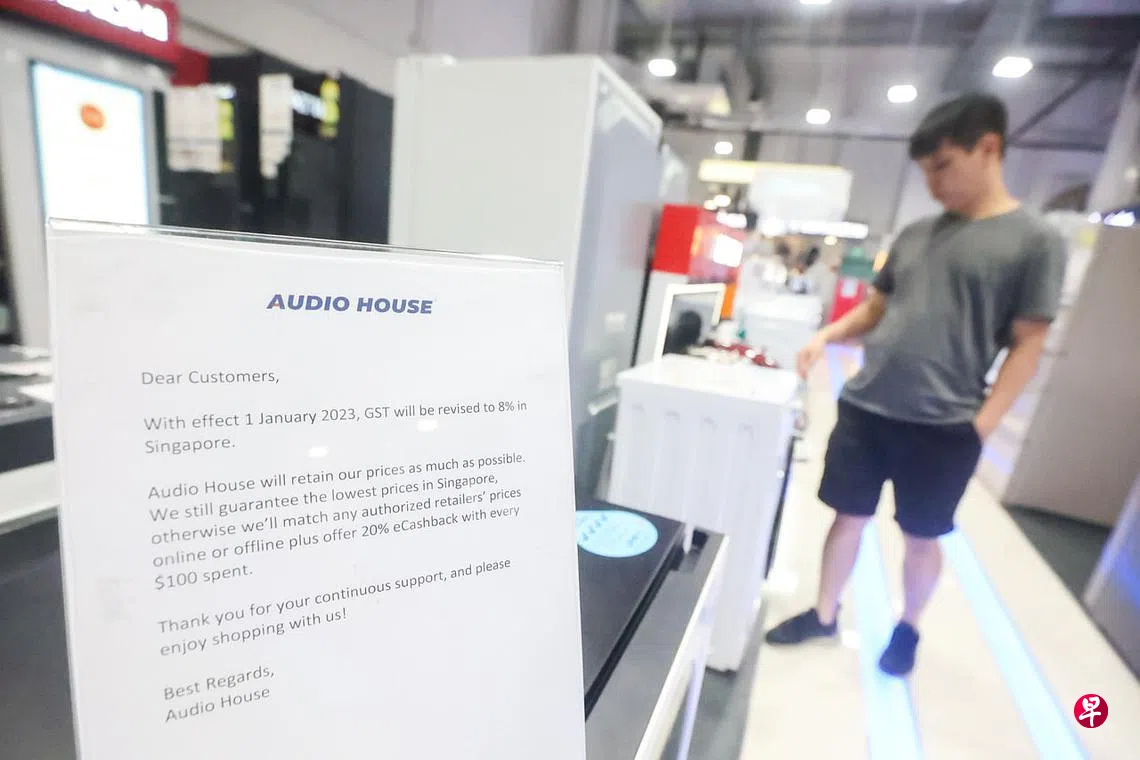 《联合早报》记者星期六(12月31日)走访大型超市和电器零售商等,商家数个星期前就开始准备工作,其中电器商音响之家(Audio House)增聘销售及客服人员和收银员,并提供消费者先付款后送货的免费储存服务。位于乌美路的零售旗舰店,已张贴通告提醒顾客,消费税即将上调,并承诺尽可能不涨价。