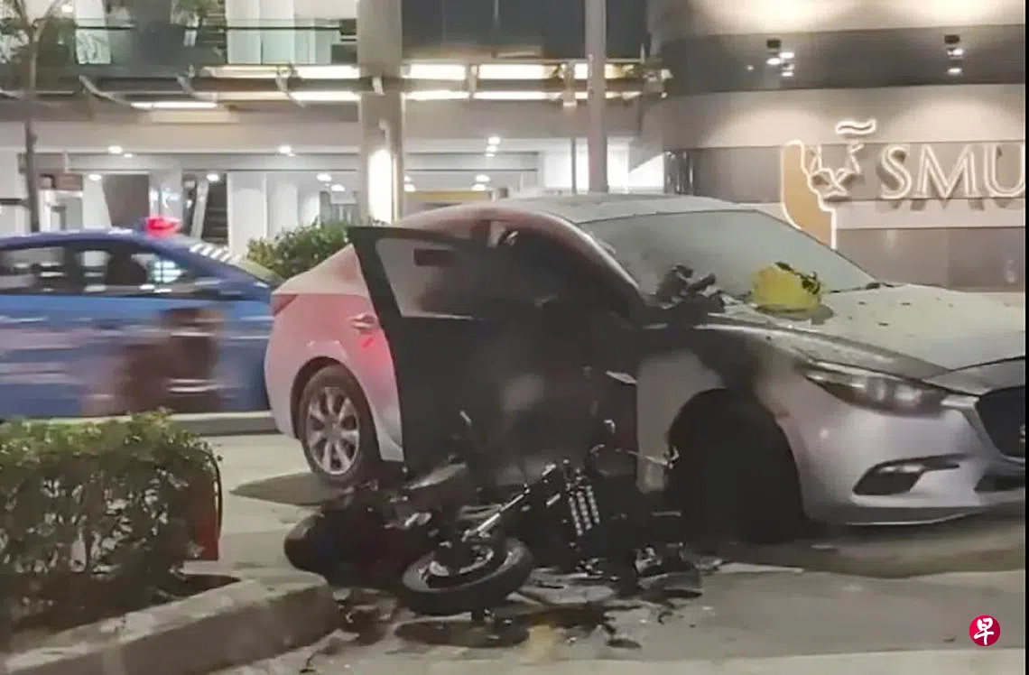 这起车祸发生在星期五(12月30日)傍晚6时45分,一辆轿车和电动脚踏车于通往福康宁路的明古连街相撞,导致电动脚踏车失火。